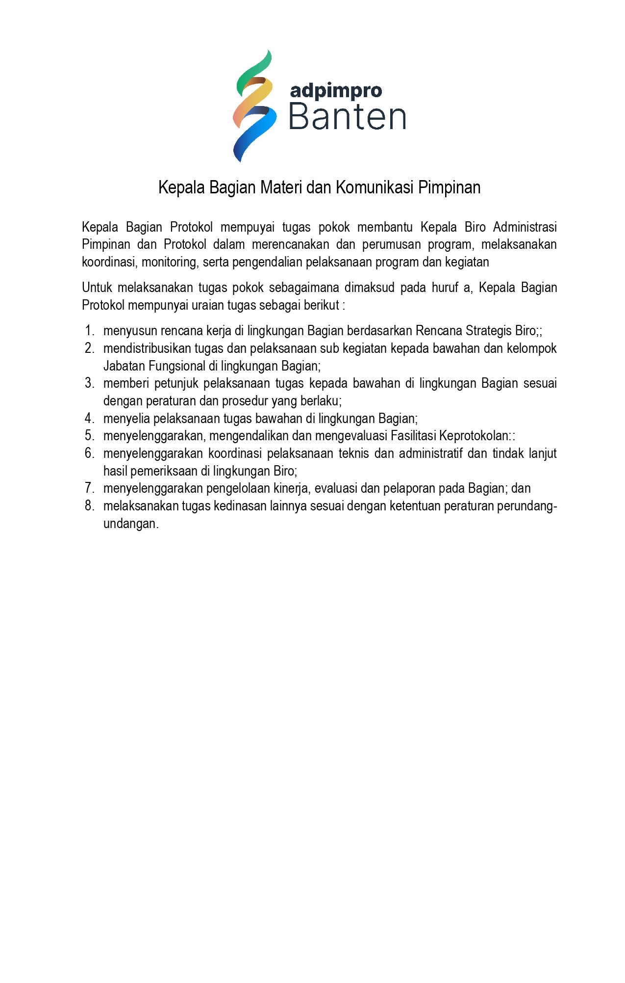 11 Jun 2025 Tugas dan Fungsi Kepala Bagian Protokol Oleh Admin Biroadpimpro 2344 View Share this Post